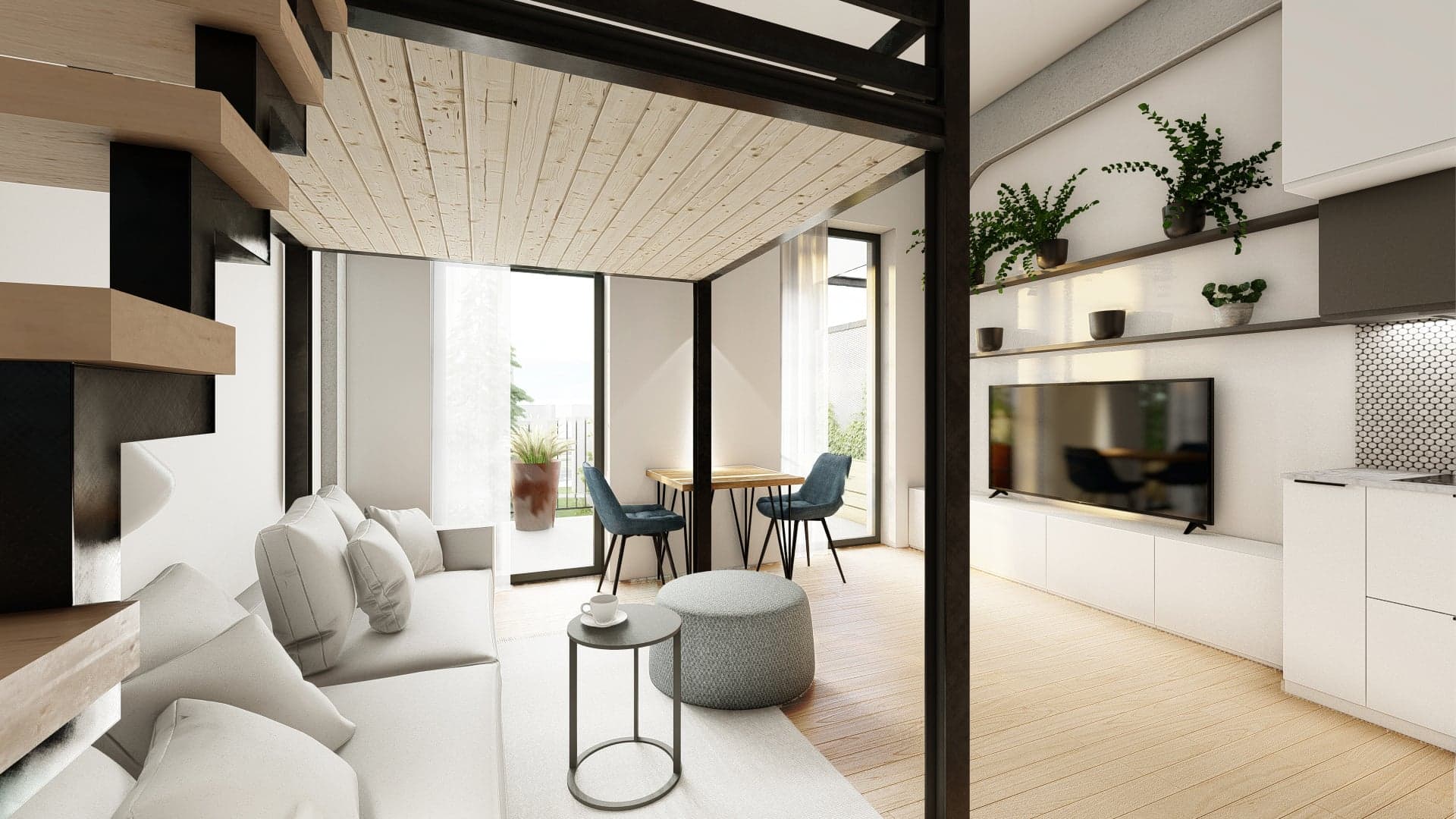 Všechny byty ve druhém a třetím patře disponují terasou, lodžií nebo balkonem, některé z nich mají i více těchto venkovních ploch, z nichž většina je orientována na jižní stranu. Pro pohodlné stínění je všude realizována příprava na venkovní elektrické žaluzie a možnost stínových plachet nebo rolet k umístění na konstrukce nad terasami. Výška stropů ve třetím patře poskytuje velkou variabilitu prostor a v menších bytech například využít vysoké stropy pro mezipatro se spaním a získat tak více pochozího prostoru.